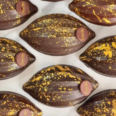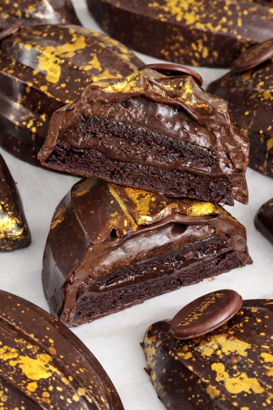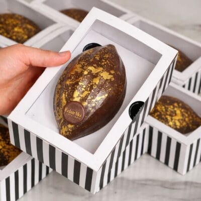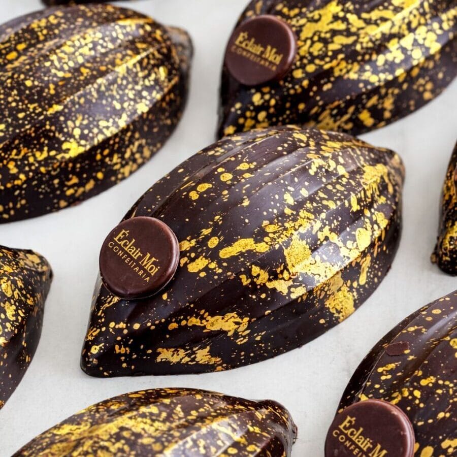 Casca de chocolate meio amargo recheado com brownie e brigadeiro de cacau