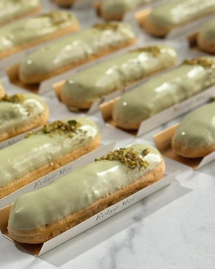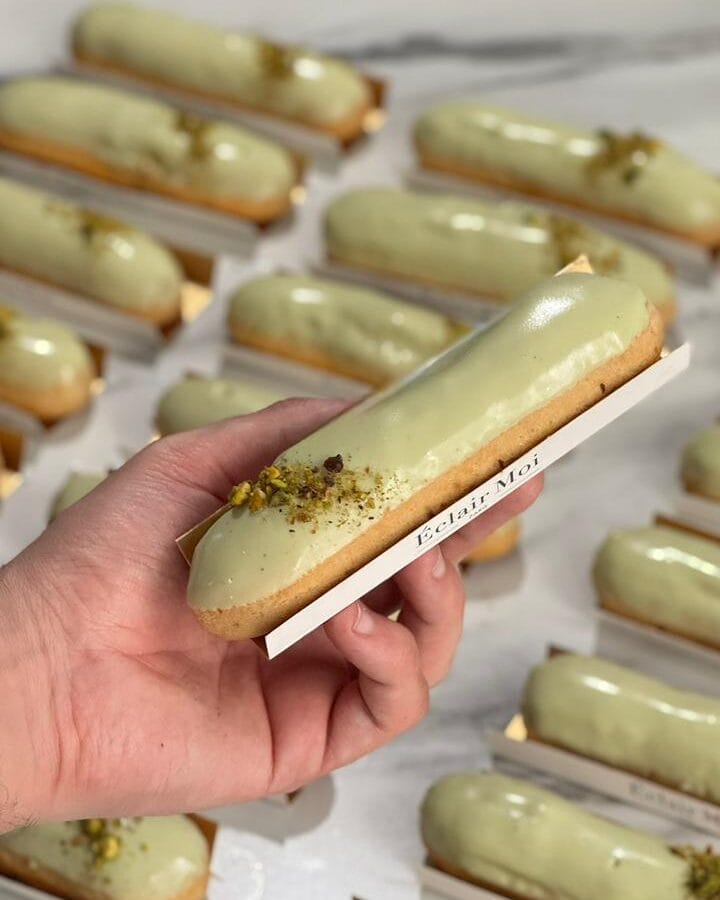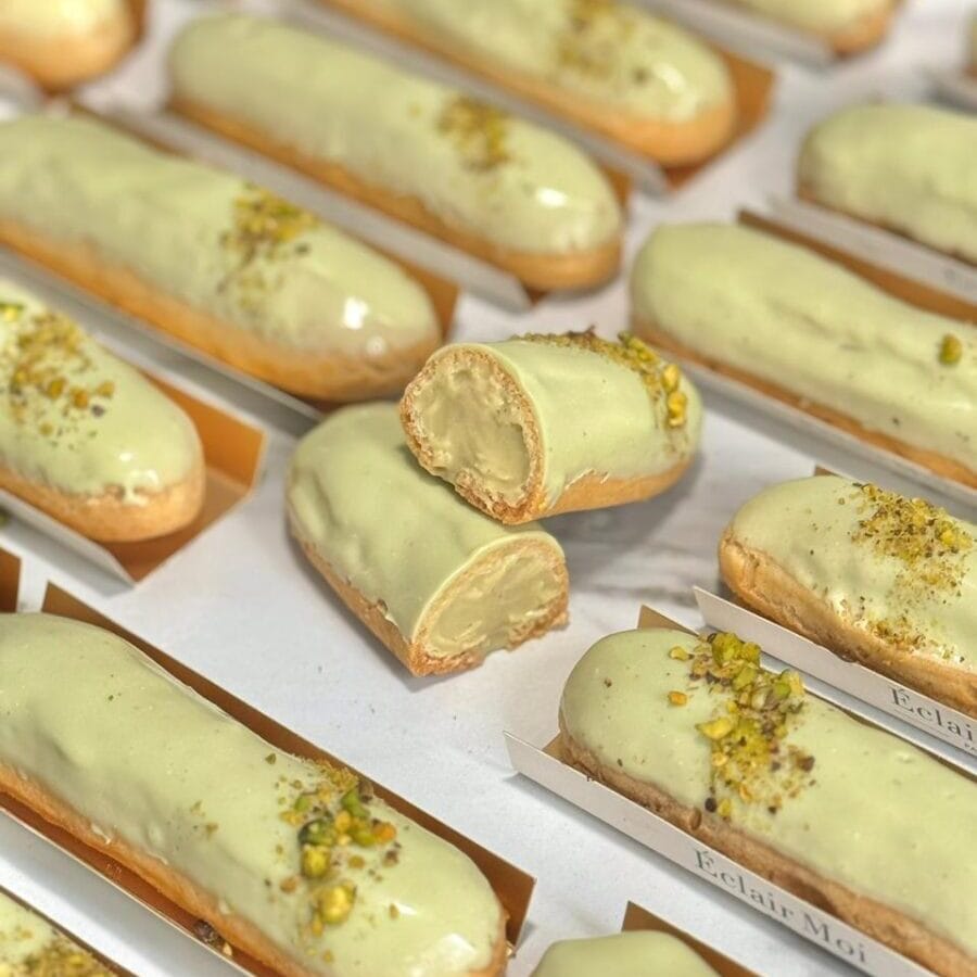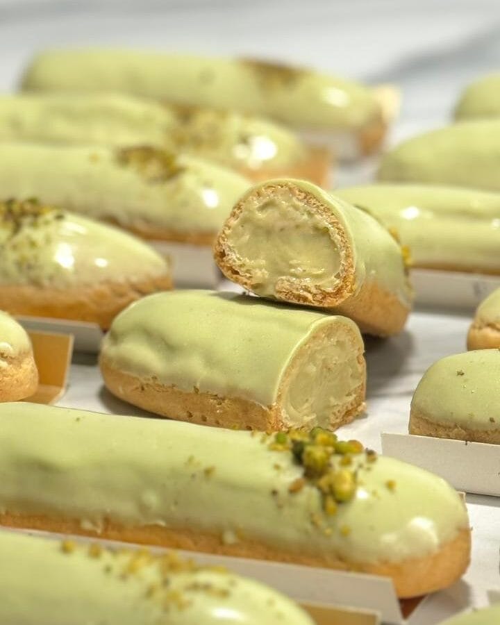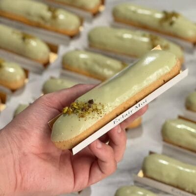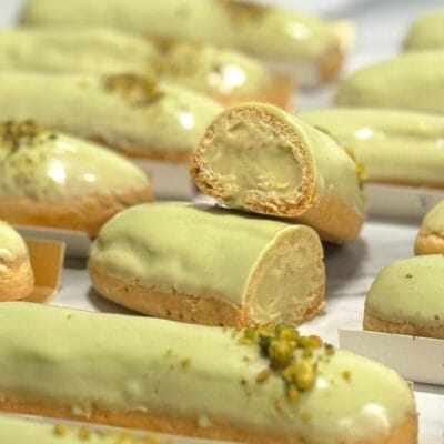 Deleite-se com a sofisticação de um éclair de pistache: a leveza da masse a choux, que se desfaz delicadamente; a cremosidade envolvente da crème pâtissière, realçada pelo sabor intenso das pistaches; e o toque final de um glaçage suave. Uma verdadeira referência francesa, que eleva o paladar a novas alturas.
