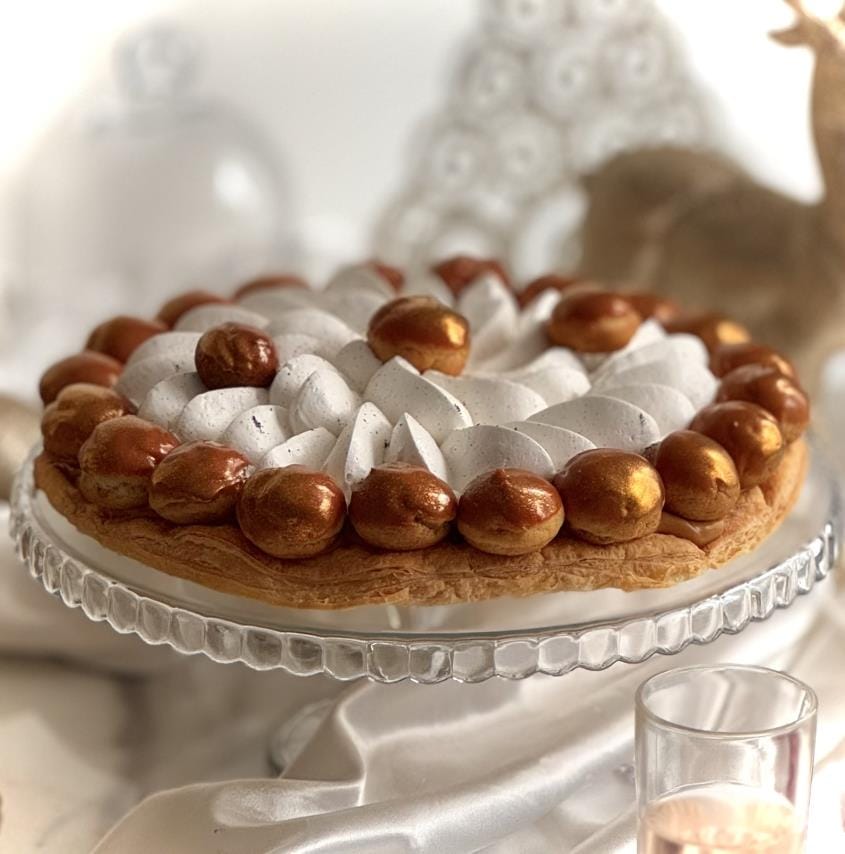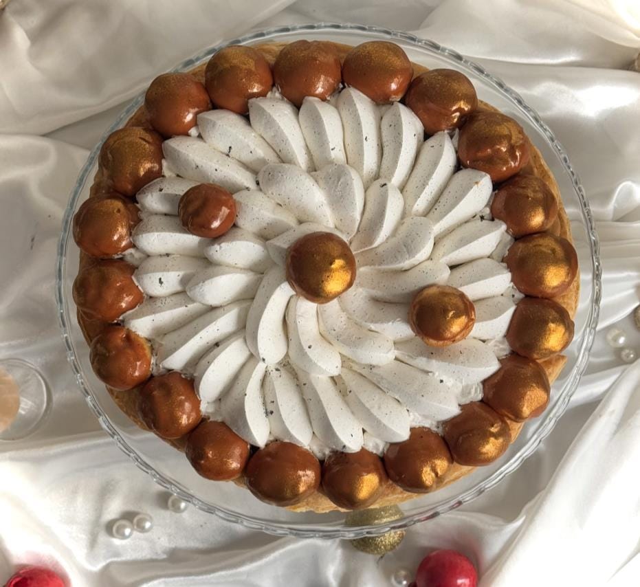 Torta com basse de massa folhada, coberta com crème de caramelo salgado, envoltas por pequenas choux de caramelo, cobertas com mousse de baunilha